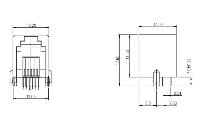 Modular Jack, RJ11, 1*1 port Contacts: 6P6C / 6P4C / 6P2C Tab up, without panel stops, through hole, side entry